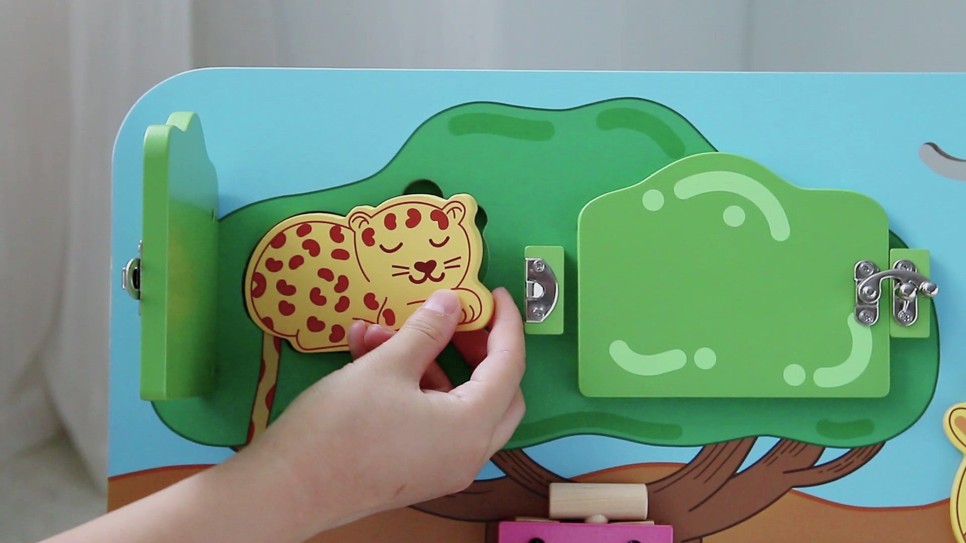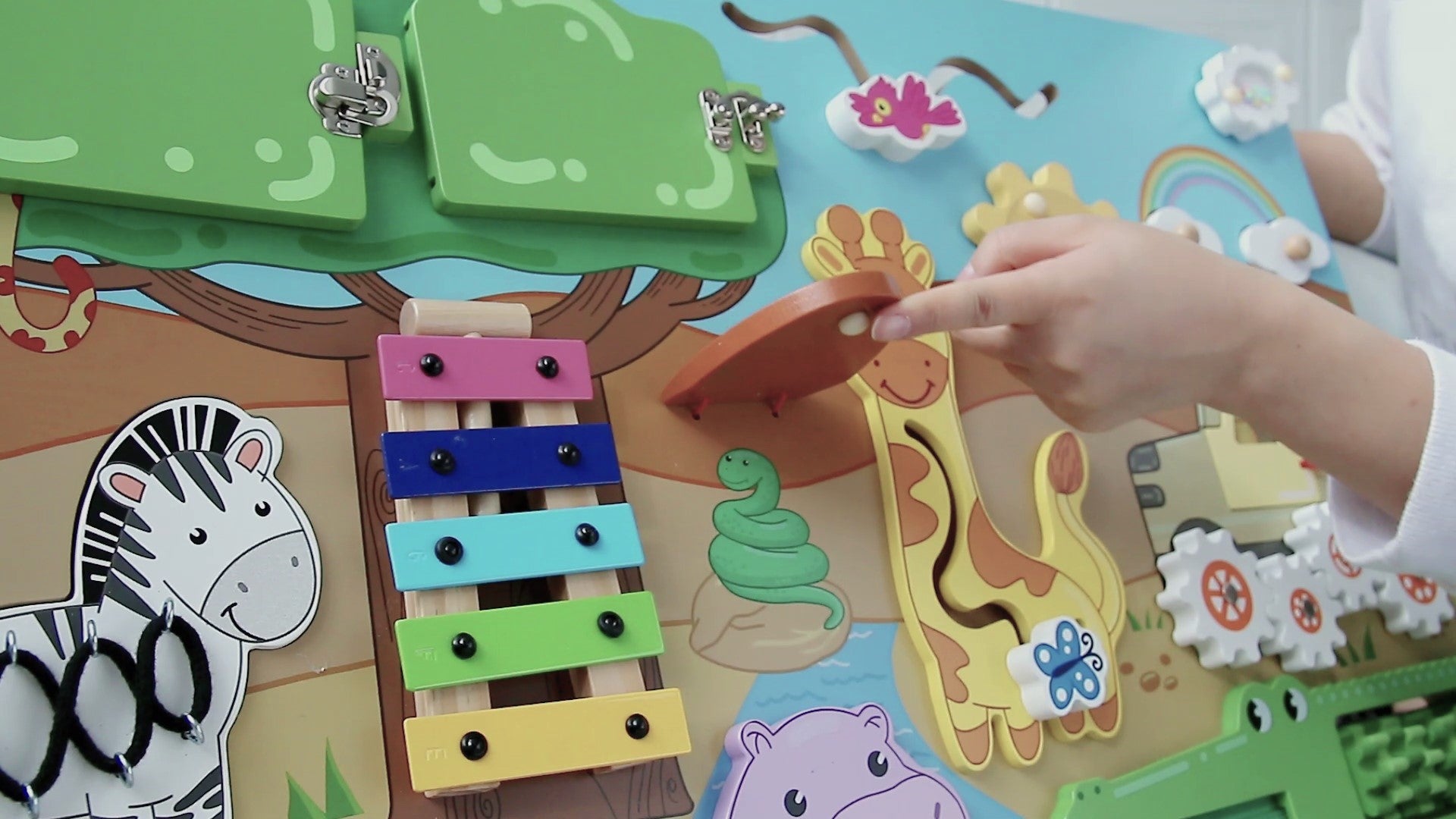 Let your toddler's imagination roar with our vibrant wooden busy board!